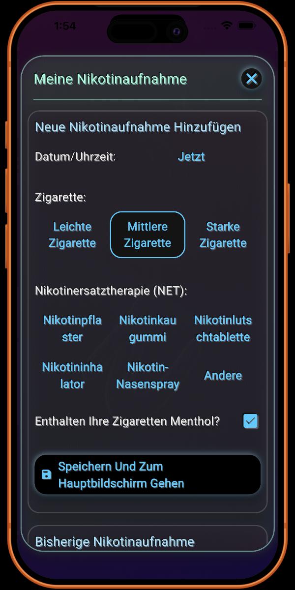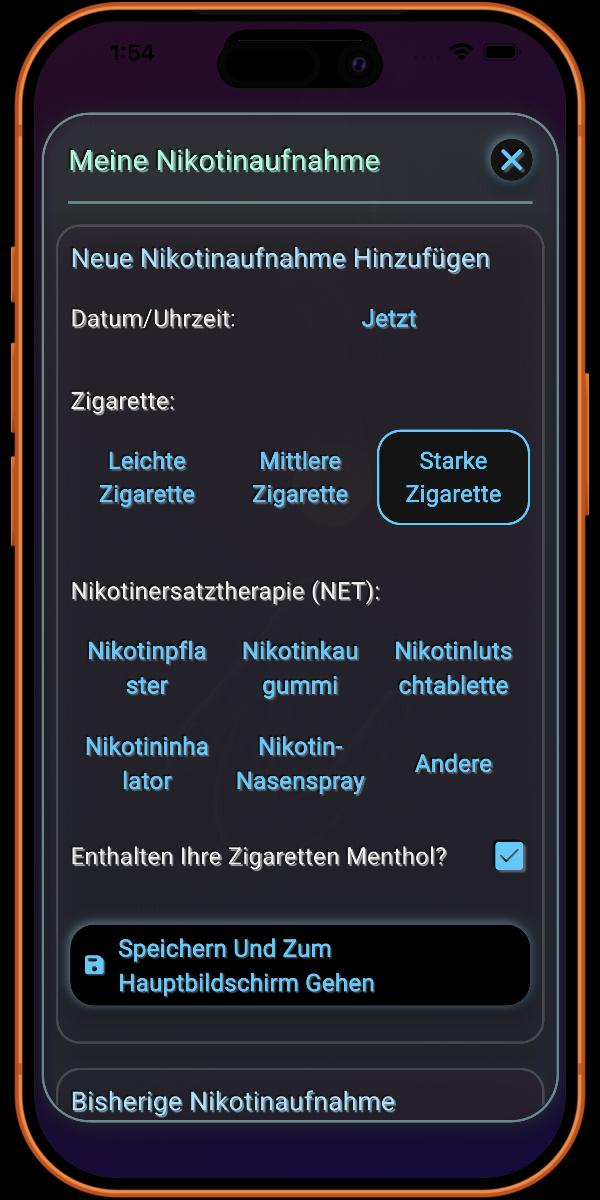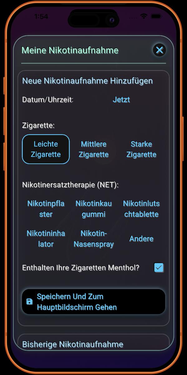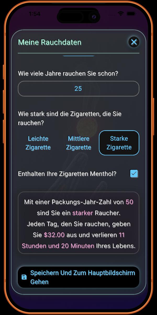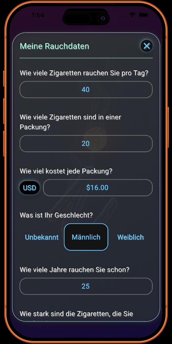 Hier fügen Sie Details zu Ihrer Rauchgewohnheit hinzu. Je mehr Informationen Sie bereitstellen, desto genauer sind die von der App bereitgestellten Details.