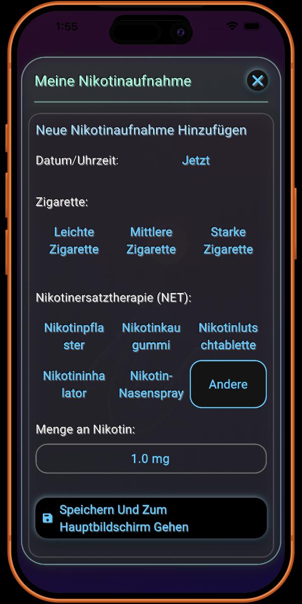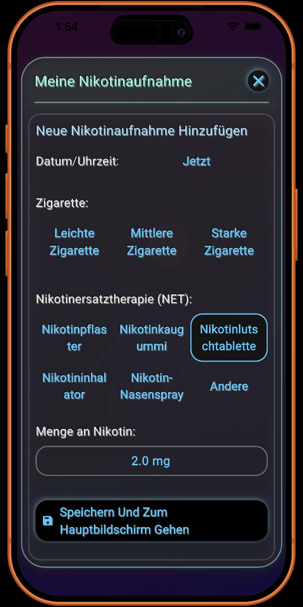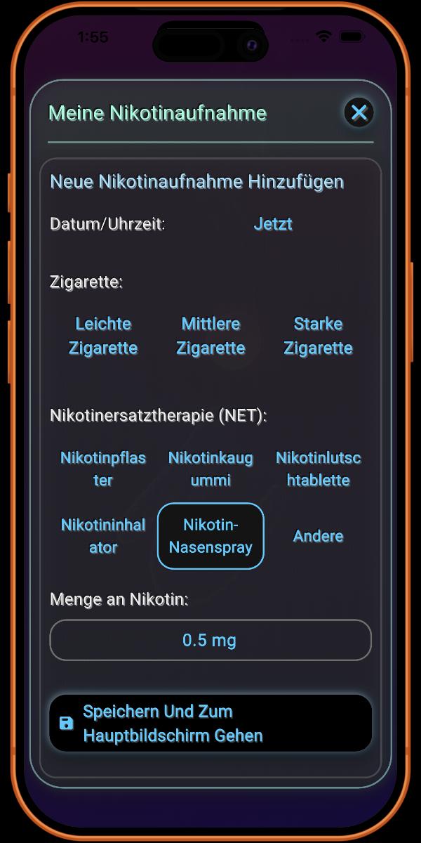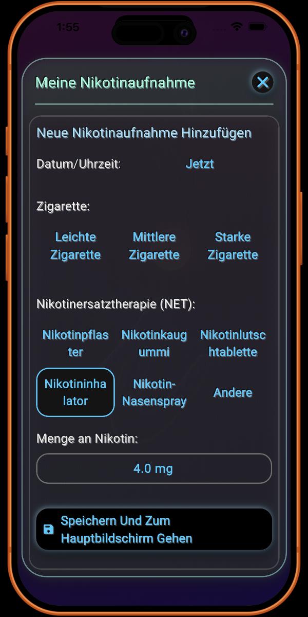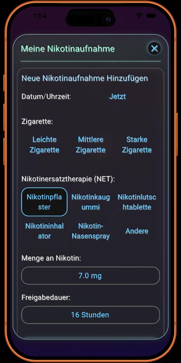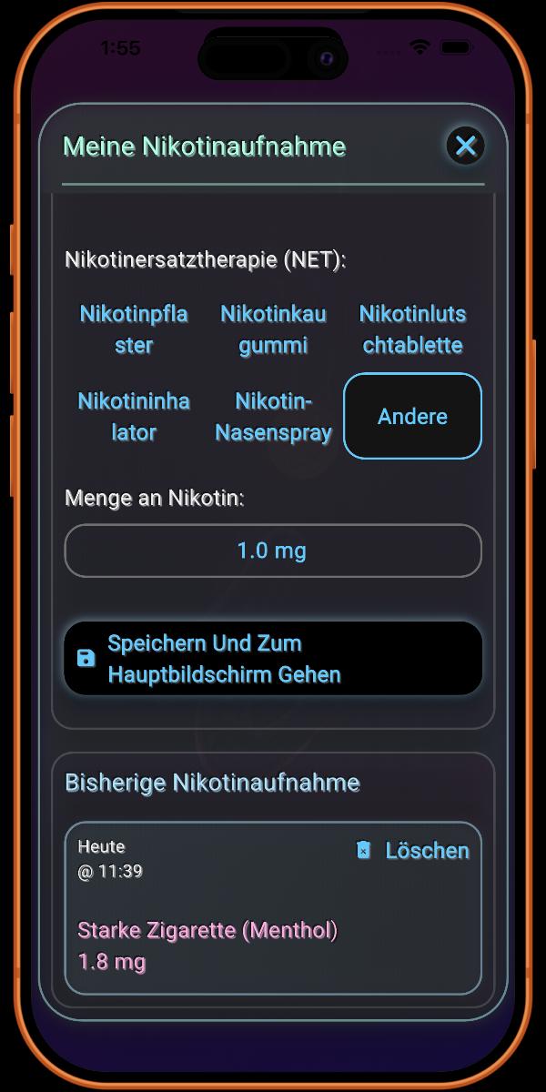 Das Protokollieren von Nikotinersatztherapien (NRT) ist eine einzigartige und zentrale Funktion der App. Dies ist wichtig, da NRT die Art und Weise verändert, wie Nikotin im Vergleich zum Rauchen einer Zigarette in den Körper gelangt. Die spezialisierte Nachverfolgung der App stellt sicher, dass Ihr Genesungsfortschritt wissenschaftlich genau bleibt.