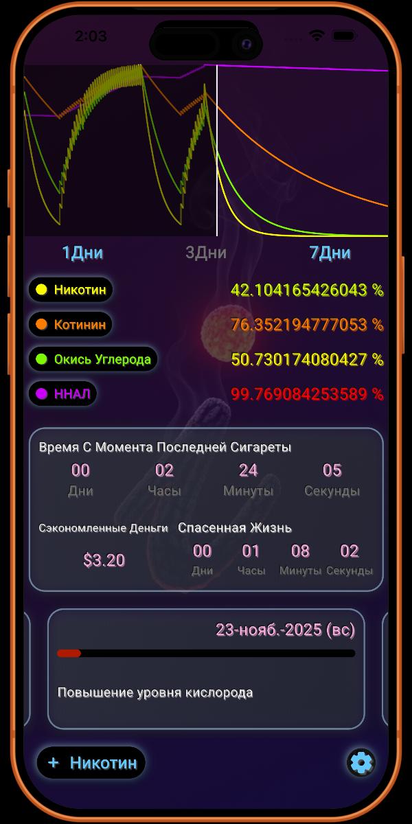 Это график по умолчанию, который показывает вам 4 химических вещества за вчера, сегодня и завтра. Он включает индикатор того, где находится текущее время. Видя, насколько вы улучшитесь на следующий день, это мотивирует вас держаться подальше от курения.
