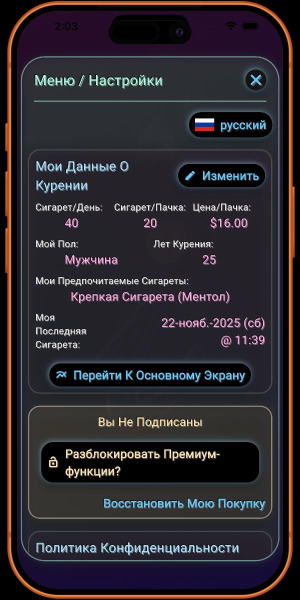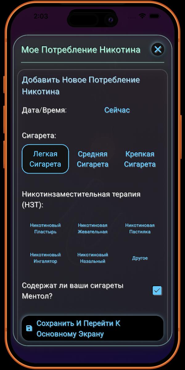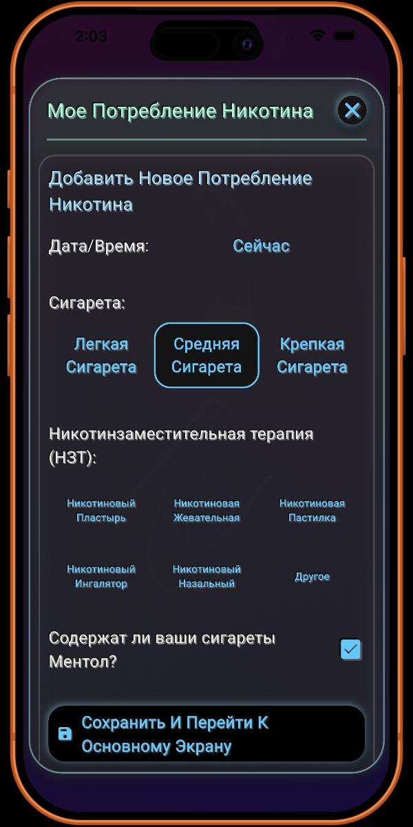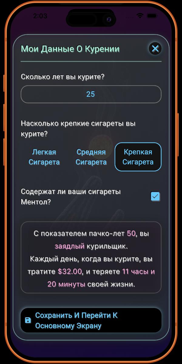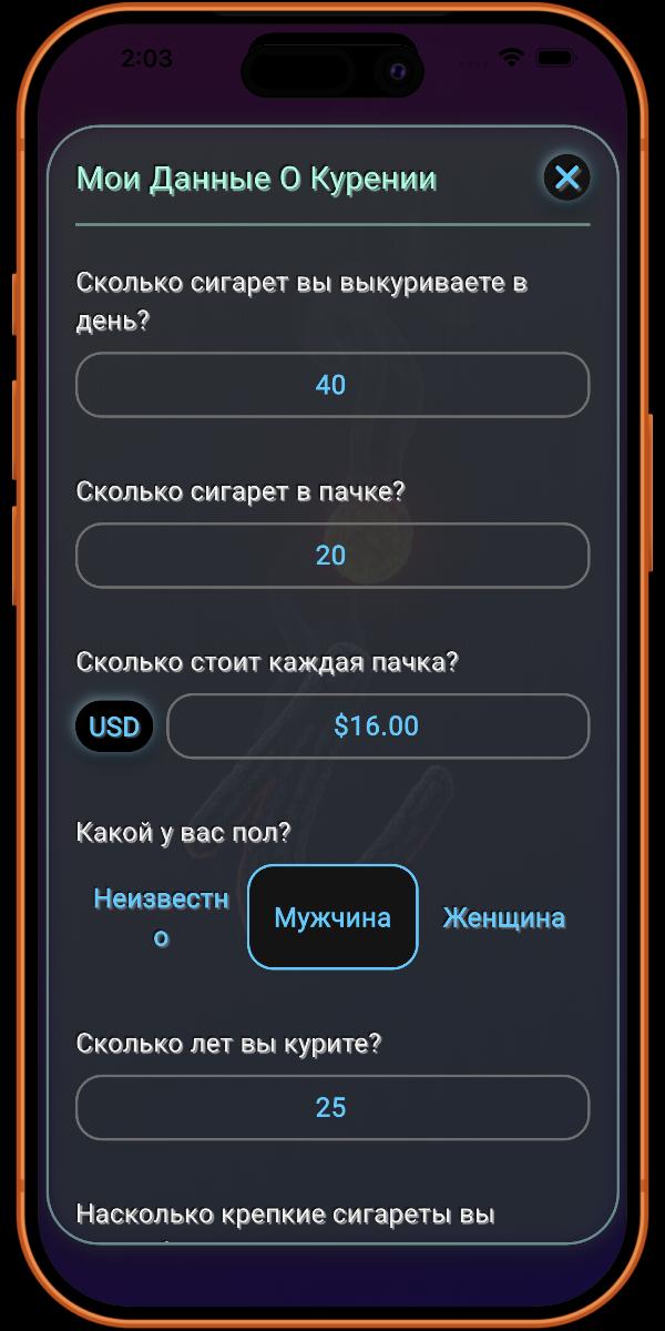 Здесь вы добавляете подробности о своей привычке курения. Чем больше информации вы предоставите, тем точнее будут данные, предоставляемые приложением.