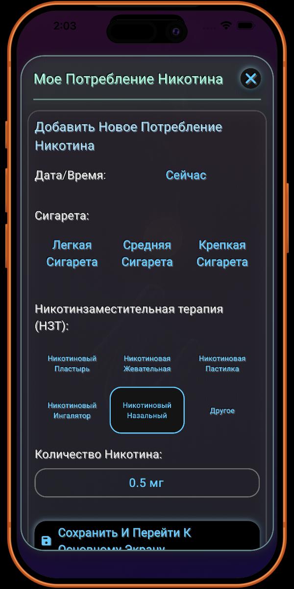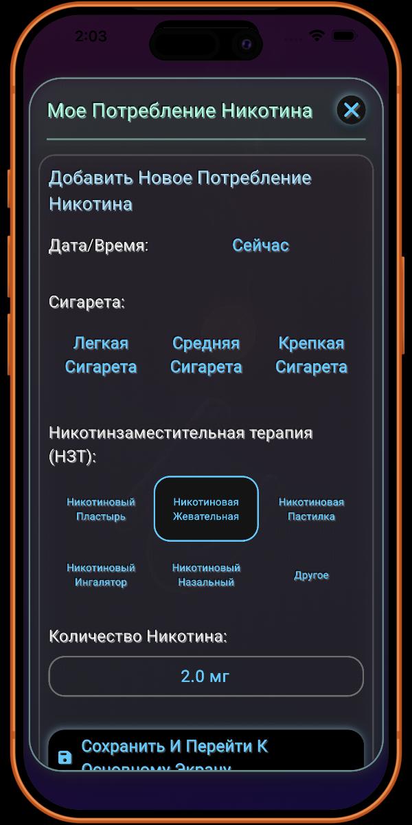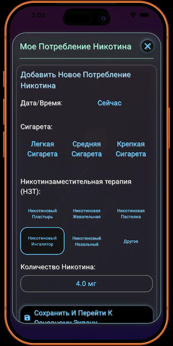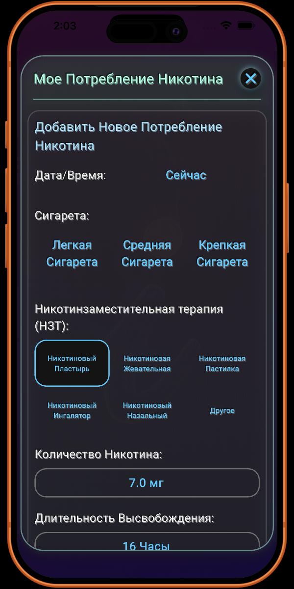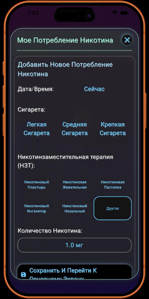 Хотя приложение поддерживает наиболее распространенные виды Никотинзаместительной Терапии (НЗТ), мы знаем, что рынок постоянно меняется. По этой причине в разделе отслеживания НЗТ предусмотрена опция «Прочее». Это позволяет вам регистрировать любой менее распространенный или неизвестный продукт НЗТ, который вы, возможно, используете. Это также гарантирует, что приложение остается эффективным и перспективным, когда бы ни появились новые продукты НЗТ.