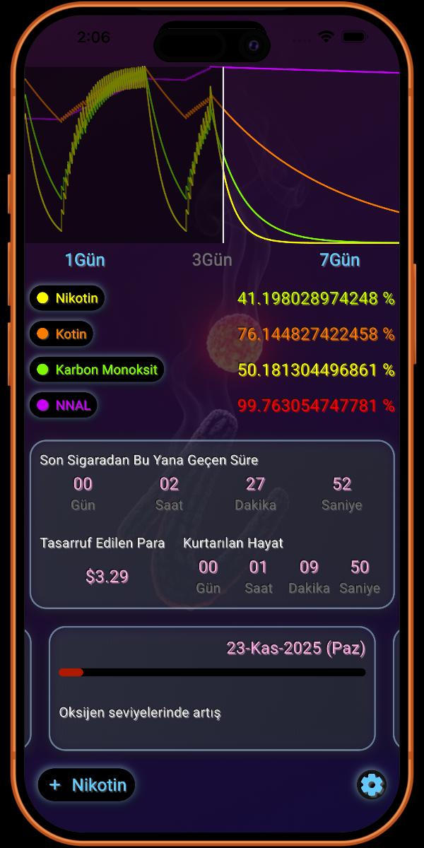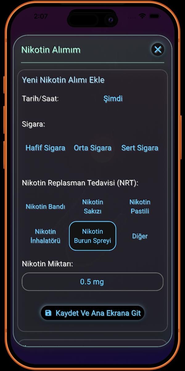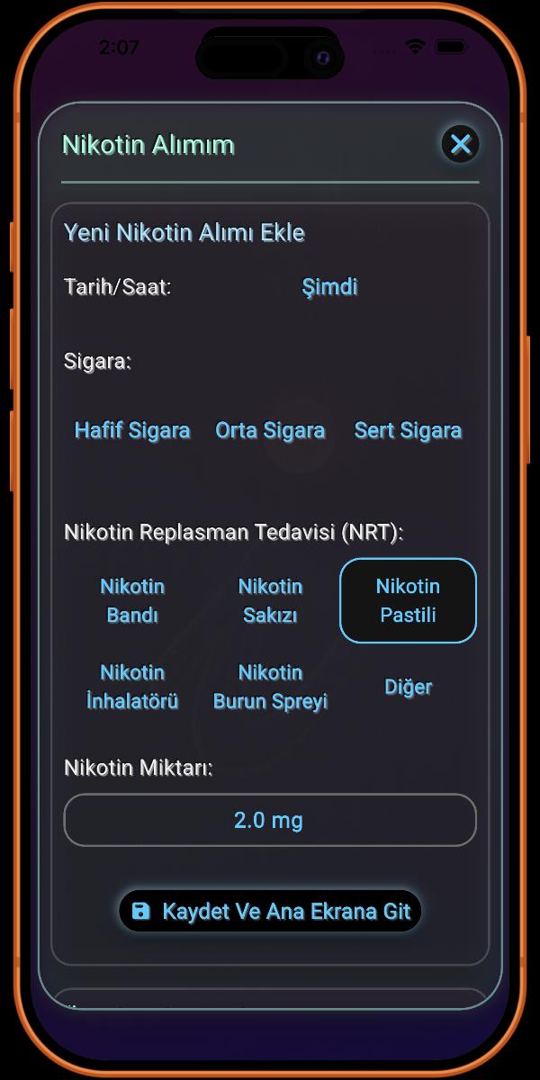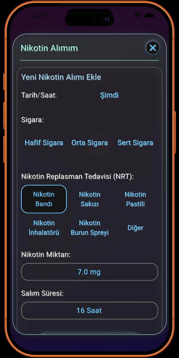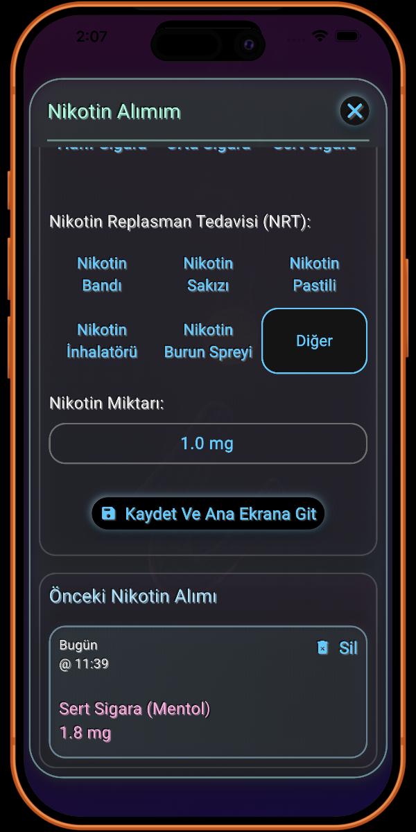 Dahası, i.Sigarayı Bırak, Karbon Monoksit ve tütüne özgü kanserojen NNAL gibi zararlı kimyasallar da dahil olmak üzere vücudunuzdan ayrılan dört ana toksini takip ederek sağlık iyileşmenize şeffaflık sağlar. Ayrıca, bu platformu Nikotin Replasman Tedavisi (NRT) girişini tam olarak entegre eden birkaç platformdan biri haline getirdim. Bu benzersiz özellik, ister aniden bırakıyor olun ister bir NRT planı kullanıyor olun, ilerlemenizin doğru bir şekilde takip edilmesini sağlayarak, nikotinsiz olma yolculuğunuzun eksiksiz ve kesin bir görünümünü sunar.