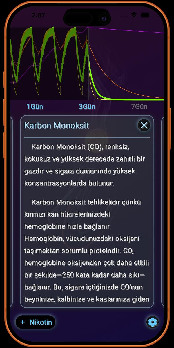 CO seviyenizin normalleşmesini izlemek, uygulamanın sağladığı en anlık ve motive edici ödüllerden biridir, kardiyovasküler sağlığınıza yönelik büyük bir tehdidi başarıyla ortadan kaldırdığınızı ve kanınızın bir kez daha oksijeni verimli bir şekilde taşıyabildiğini teyit eder.