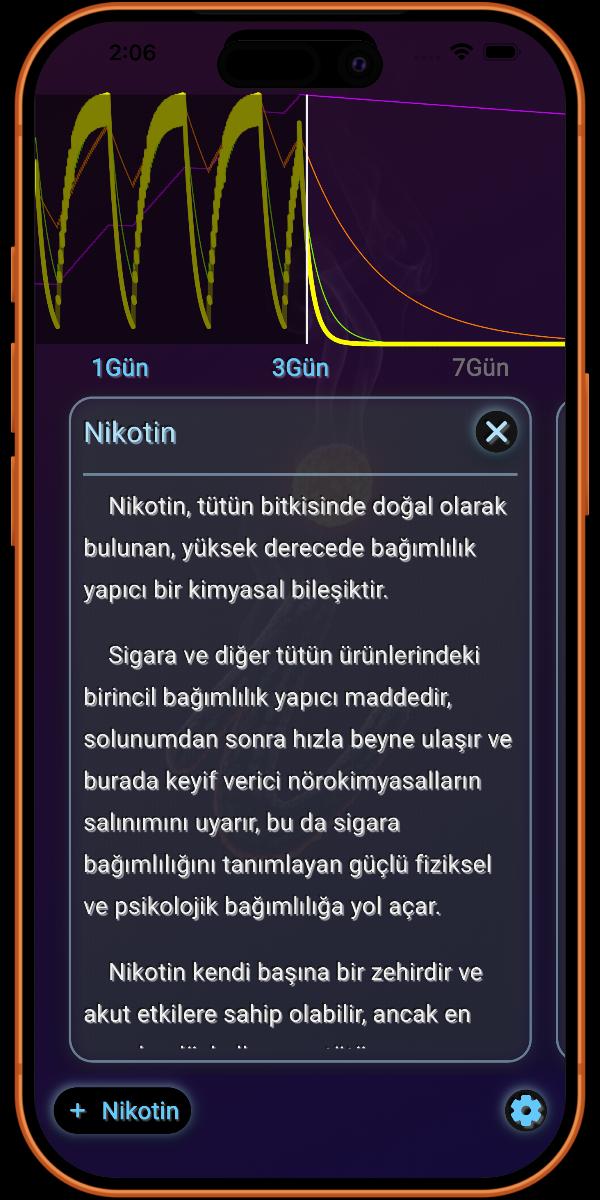 Bu, size dün, bugün ve yarın için 4 kimyasalı gösteren varsayılan grafiktir. Mevcut saatin nerede olduğuna dair bir gösterge içerir. Ertesi gün ne kadar iyileşeceğinizi görmek, sizi sigaradan uzak durmaya motive eder.