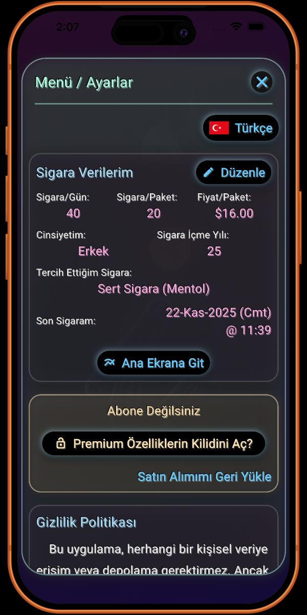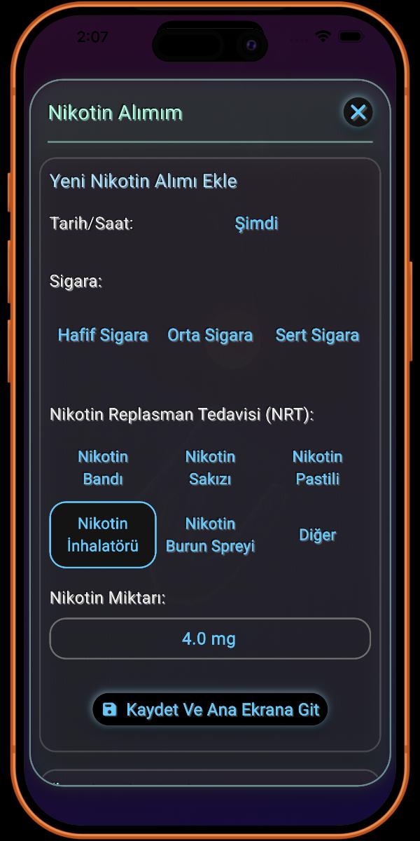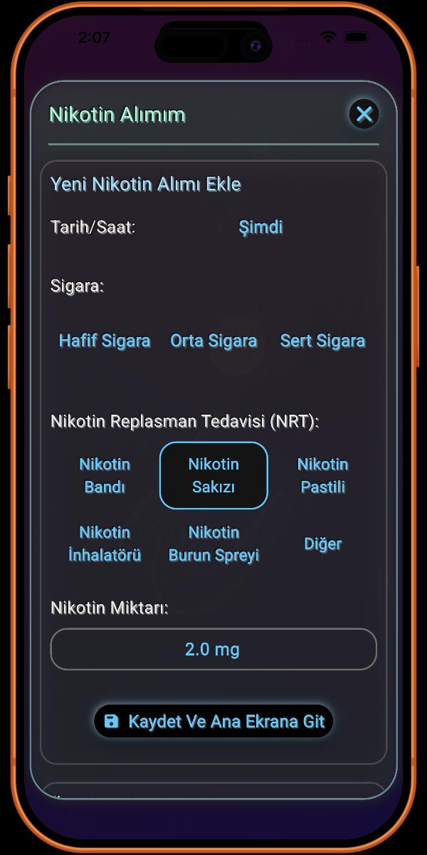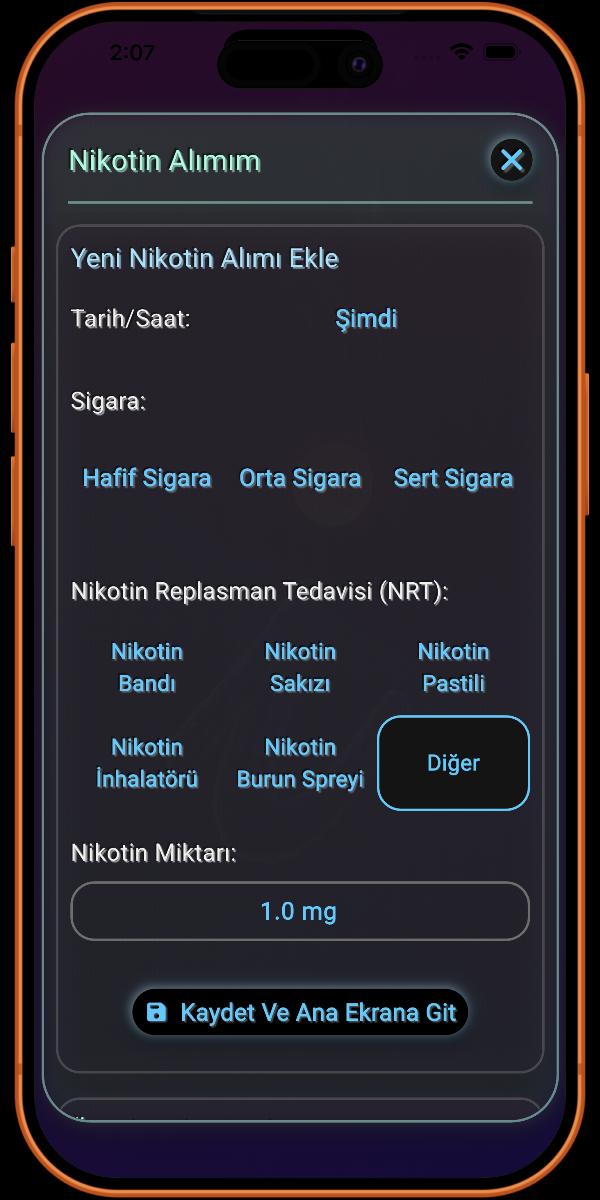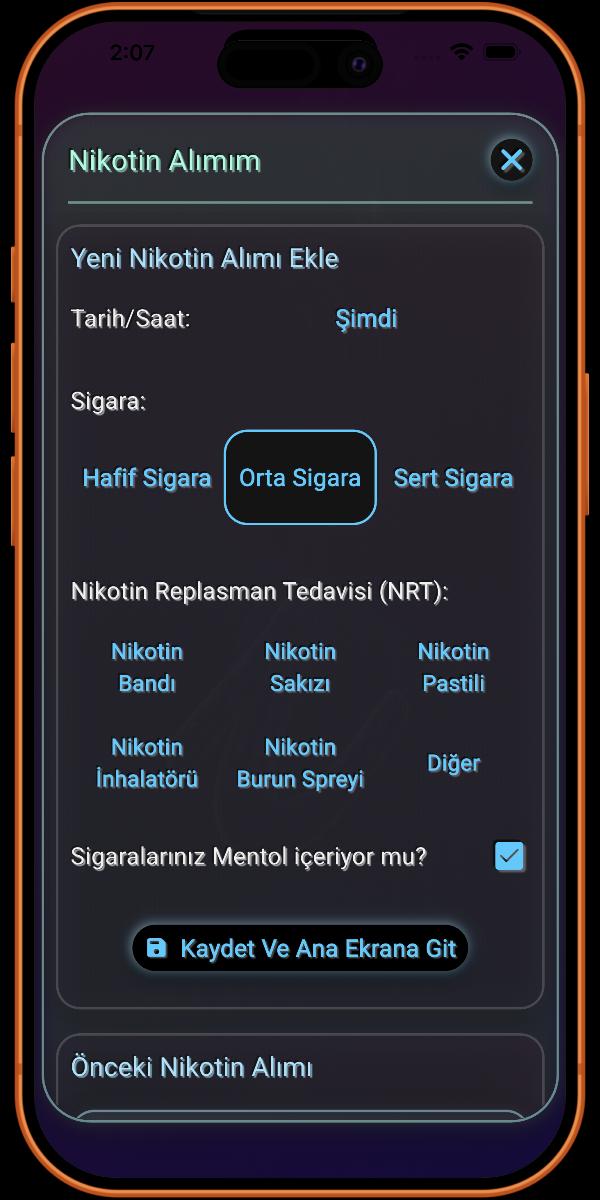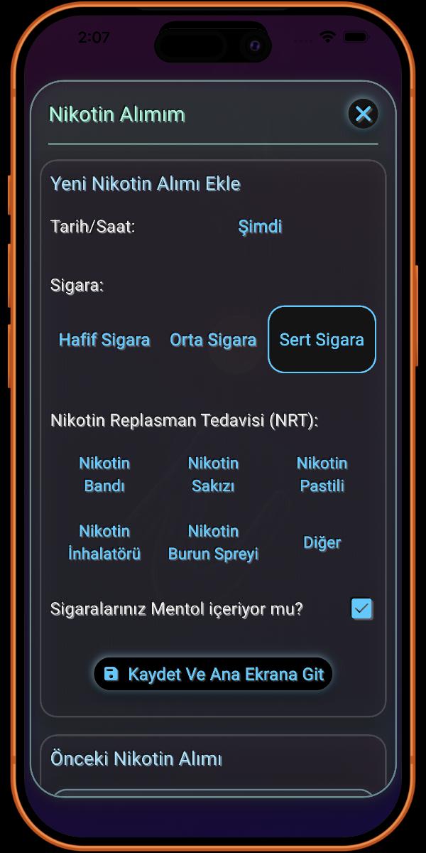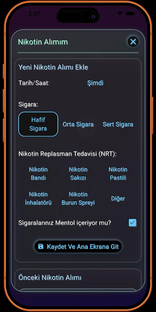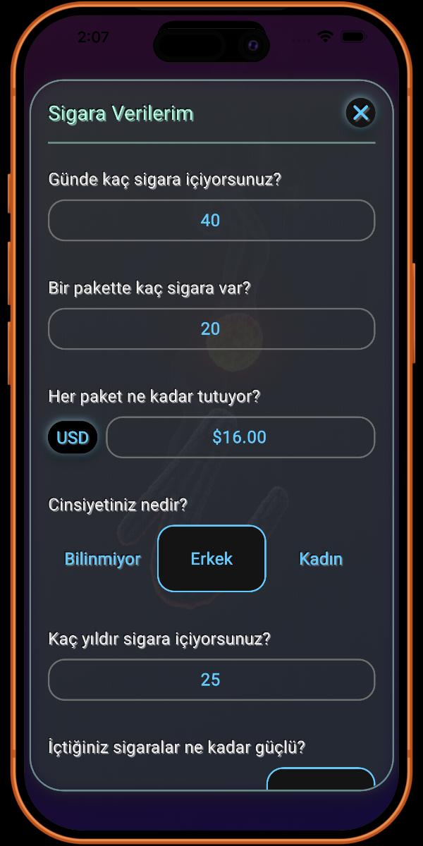 Burası sigara içme alışkanlığınızla ilgili detayları eklediğiniz yerdir. Ne kadar çok bilgi sağlarsanız, uygulama tarafından sağlanan detaylar o kadar doğru olur.