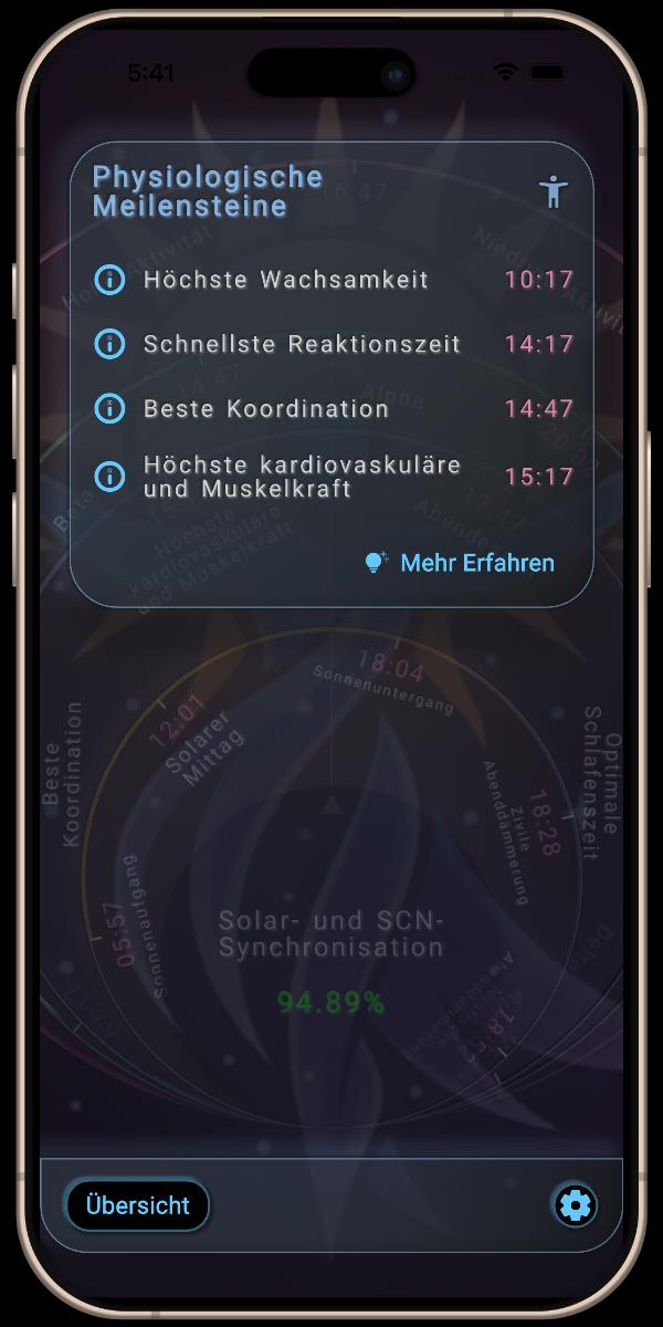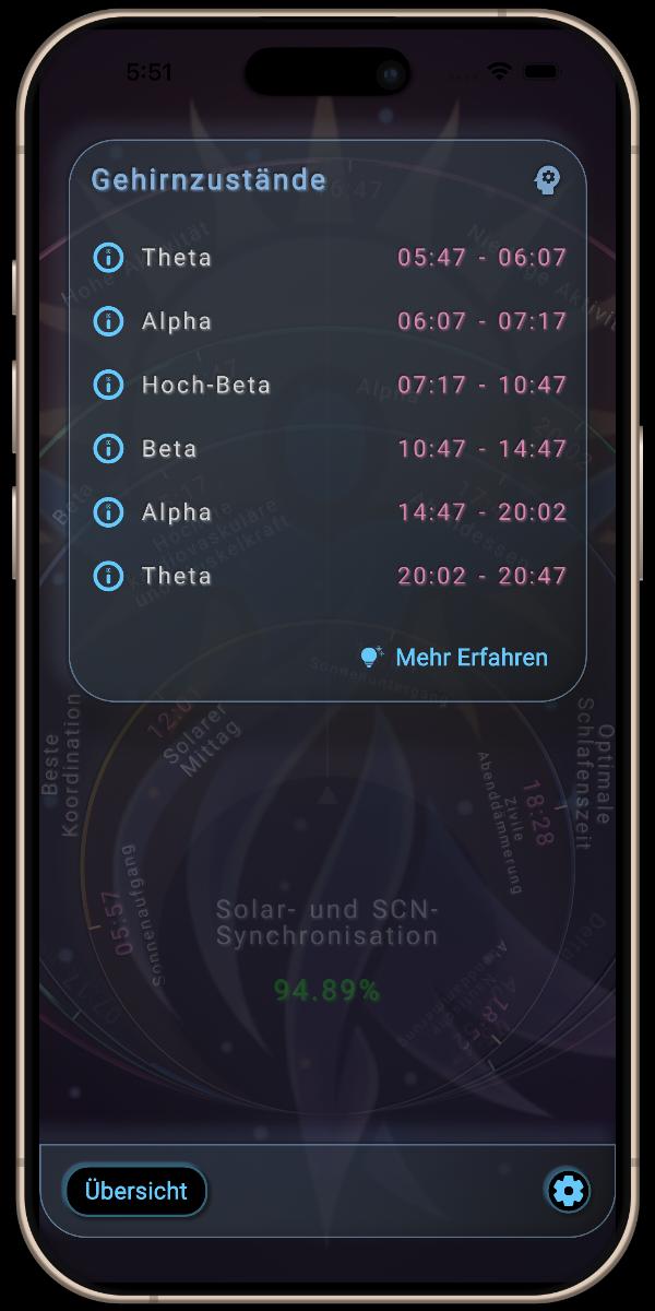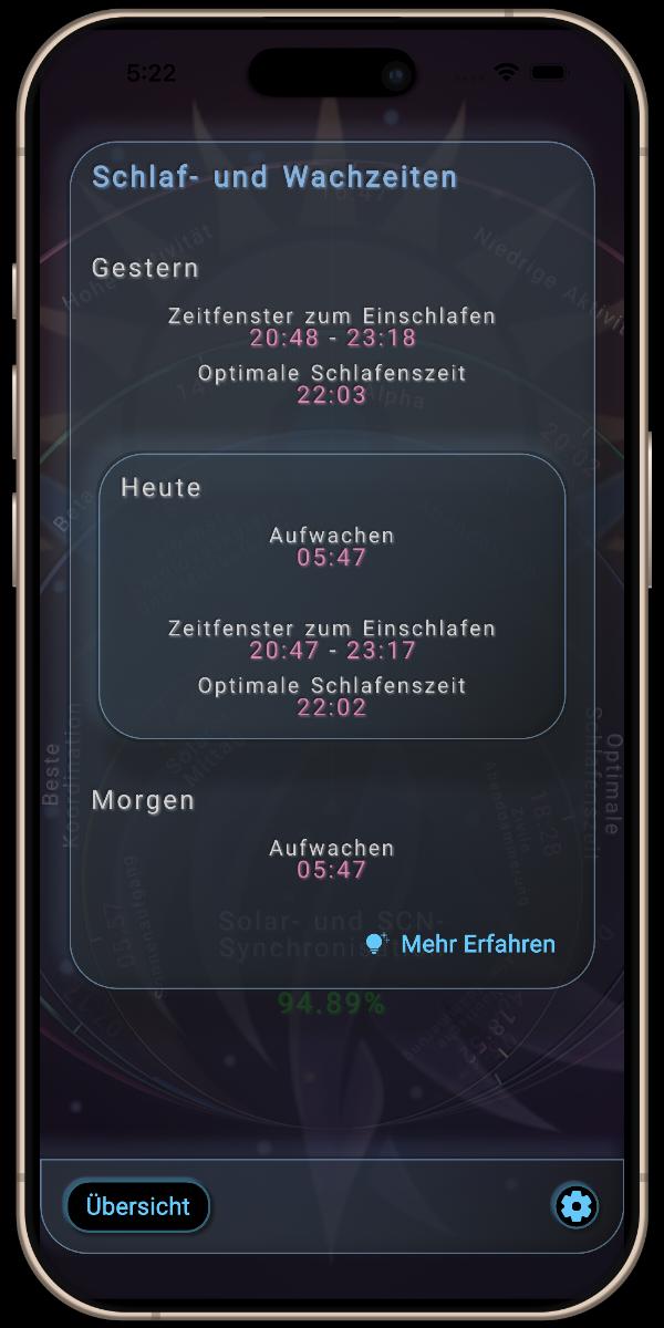 Dies spiegelt die Ausrichtung zwischen dem optimalen Sonnenfenster und dem tatsächlichen Zeitraum der internen SCN-Phase wider. Das '▲'-Symbol dient als klarer Indikator dafür, wie stark die Phase aus dem Takt geraten ist und ob sie früher oder später als zum optimalen Zeitpunkt eintritt.