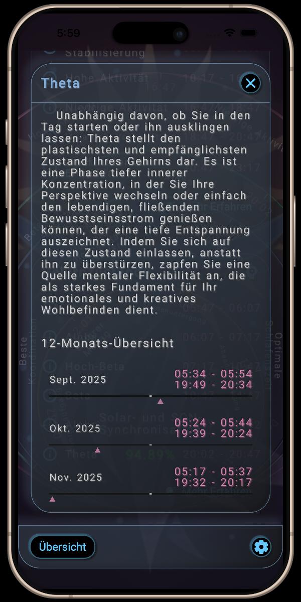 Das Klicken auf das 'ⓘ'-Symbol für einen Meilenstein oder eine Phase öffnet eine Detailansicht mit einer kurzen Beschreibung dieses Ereignisses. Ihnen wird auch eine 12-Monats-Zusammenfassung der Zeitpunkte des Ereignisses angezeigt – für den Vortag, den Folgetag sowie 5 Monate davor und 6 Monate danach – was einen vollständigen Überblick darüber gibt, wie stark sich die Zeitpunkte im Laufe des Jahres verschieben.
