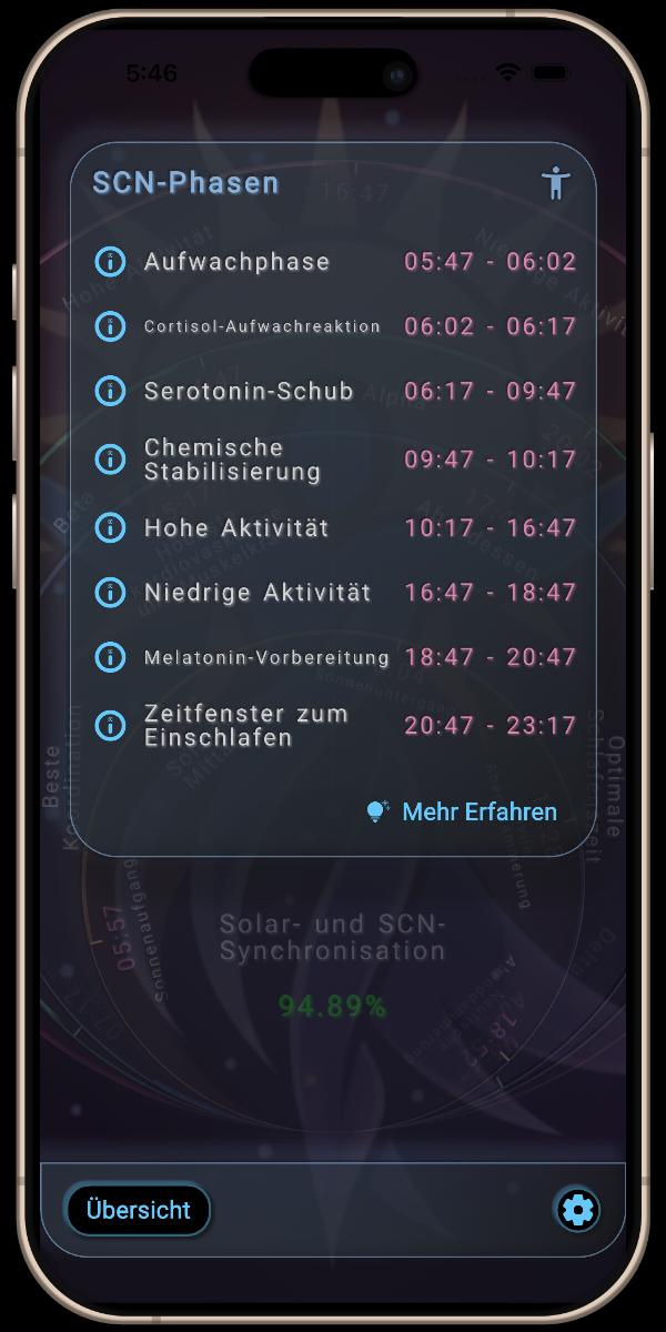 Dieser Abschnitt bietet eine detaillierte Aufschlüsselung der Solar- & SCN-Synchronisation des Tages und zeigt die Synchronisationsdurchschnitte für den Morgen und den Abend sowie deren wichtigste SCN-Phasen: