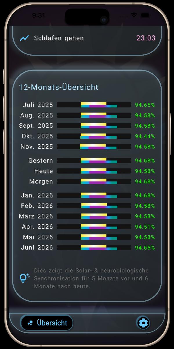 Um einen umfassenden Überblick über Ihre biologische Reise zu geben, bietet die 12-Monats-Übersicht eine aussagekräftige visuelle Darstellung Ihrer Anpassung an die wechselnden Jahreszeiten. In diesem Abschnitt können Sie Ihre Synchronisation mit absoluter Präzision verfolgen. Dabei wird ein „Sync-Prozentsatz“ nicht nur für heute, sondern auch für den unmittelbar vorangegangenen und folgenden Tag angezeigt. Durch die Erweiterung dieser Perspektive auf fünf Monate in der Vergangenheit und sechs Monate in der Zukunft bietet die App einen vollständigen 12-monatigen Überblick über Ihre Beziehung zur Sonne. Diese Langzeitdaten ermöglichen es Ihnen, vorauszusehen, wie sich verschiebende Sonnenwinkel das ganze Jahr über auf Ihre innere Uhr auswirken, sodass Sie auch bei Veränderungen in Ihrer Umgebung im Einklang bleiben.