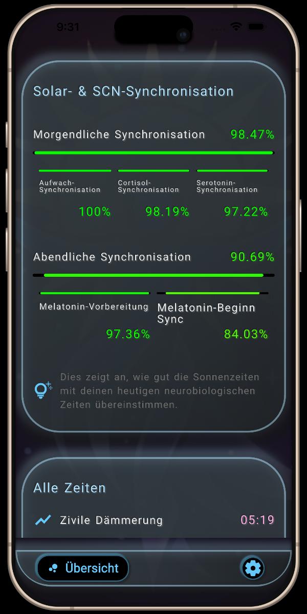 Die Synchronisation ist in zwei lebenswichtige Fenster unterteilt: Ihre Morgen- und Abend-Synchronisation. Anstatt nur die „Zeit im Freien“ zu erfassen, bewertet meine App die spezifische Qualität und Intensität des verfügbaren Lichts während Ihrer morgendlichen Aktivierung und Ihres abendlichen Ausklangs. Durch den Vergleich dieser tatsächlichen Sonnenbedingungen mit den Anforderungen Ihrer inneren Uhr können Sie genau feststellen, wo Ihre Umgebung mit Ihrer Biologie im Einklang steht – und wo eine mangelnde Abstimmung Ihre Vitalität dämpfen oder Ihre Ruhe stören könnte.