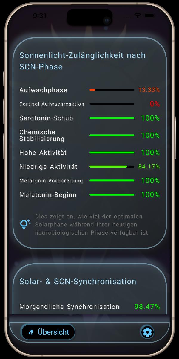 Die Hauptansicht der App ist die Zusammenfassung der solaren und neurobiologischen Phasen, inklusive einer Anzeige Ihres aktuellen Status.