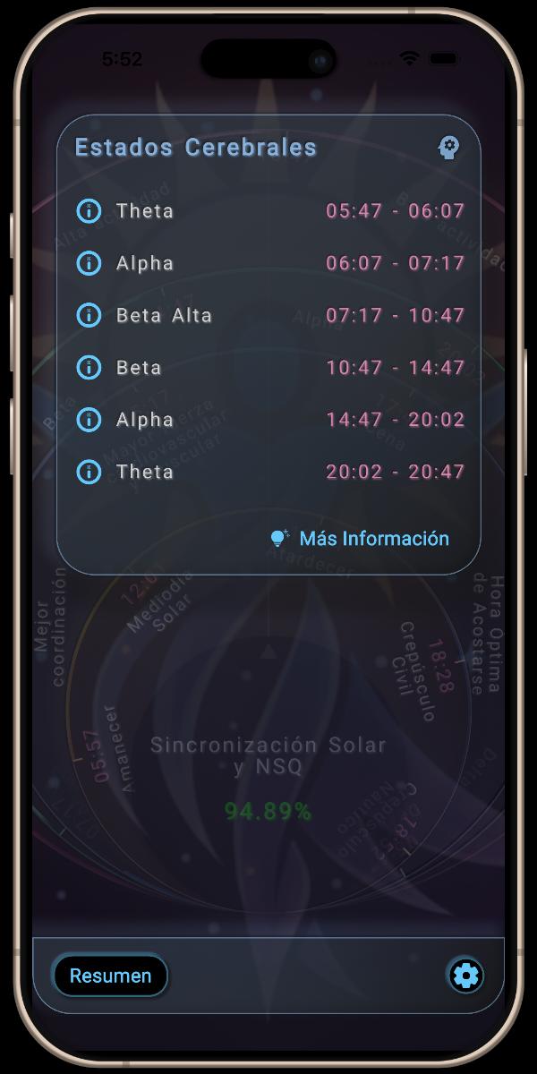 La pantalla principal de Empoderamiento Solar ofrece los datos esenciales que necesita para el momento presente. Presentados en intuitivos anillos rotatorios, sus datos neurobiológicos se organizan en cinco categorías clave para una referencia fluida:
