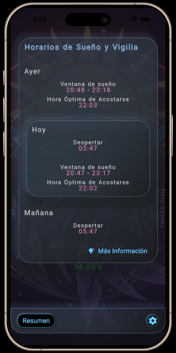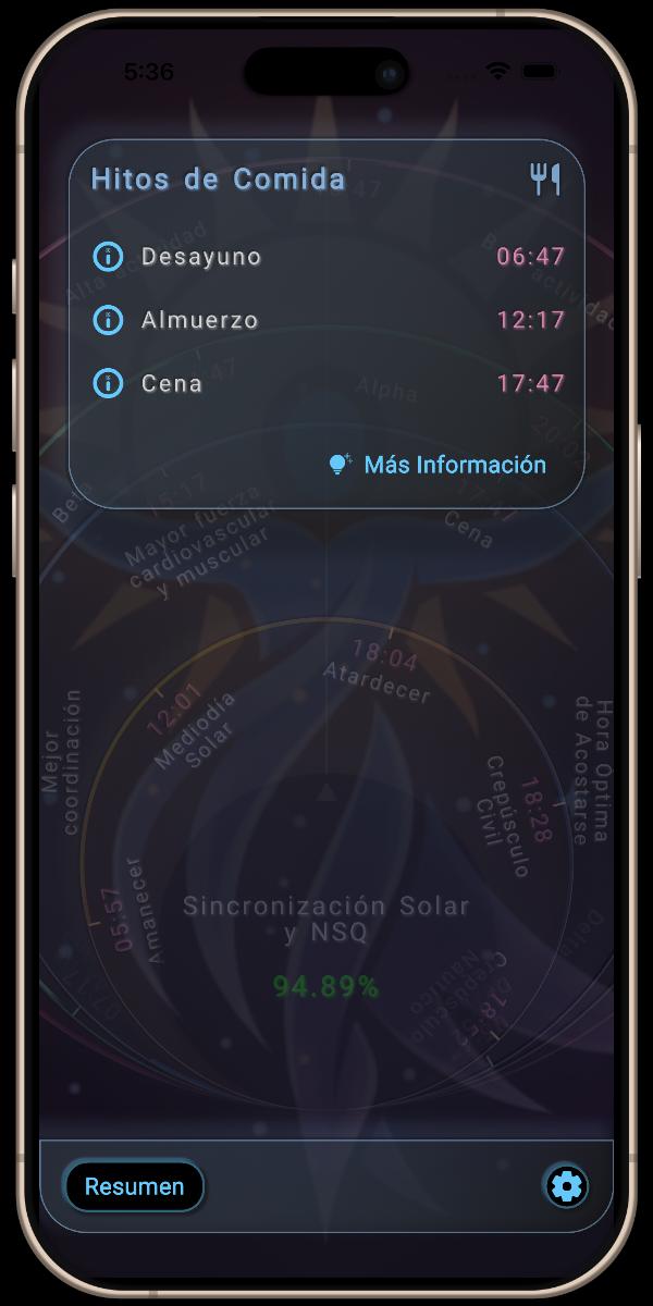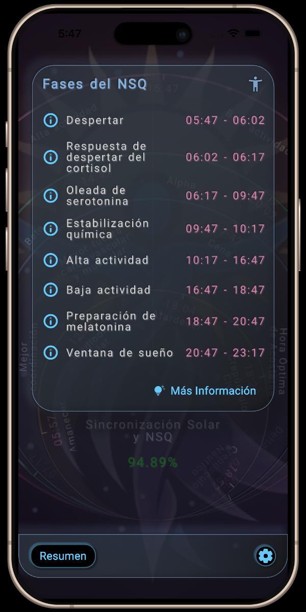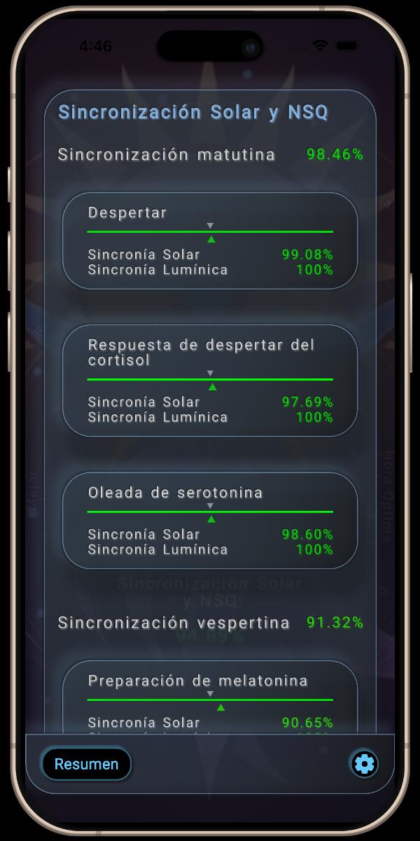 Esta sección proporciona un desglose detallado de la Sincronización Solar y NSQ del día, mostrando los promedios de sincronización para la mañana y la tarde, así como sus fases clave del NSQ: