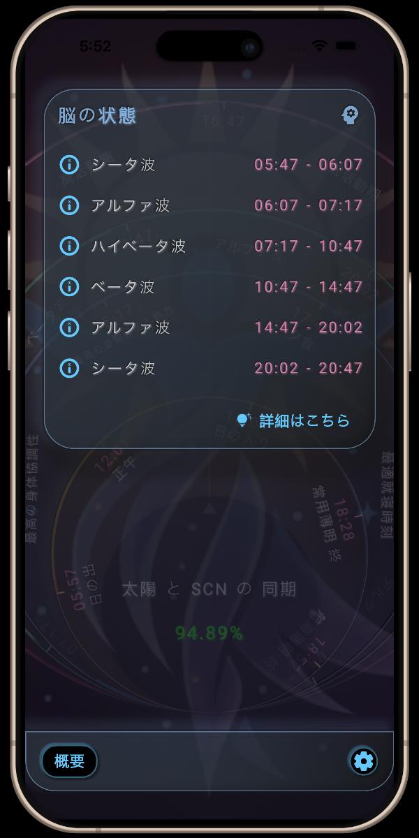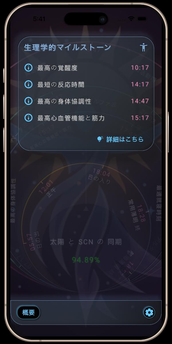 「太陽の力で自己研鑽」のメイン画面は、今この瞬間に必要な重要データを提供します。直感的な回転リングで表示されるあなたの神経生物学的データは、参照しやすいように5つの主要カテゴリに分類されています: