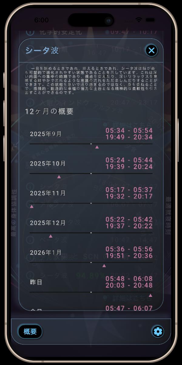 マイルストーンやフェーズの「ⓘ」アイコンをクリックすると、そのイベントの簡単な説明を含む詳細ビューが開きます。また、前日、翌日、および 5 か月前と 6 か月後をカバーするイベント時刻の 12 か月間の概要も表示され、年間を通じて時刻がどれだけ変動(ドリフト)するかを完全に把握できます。