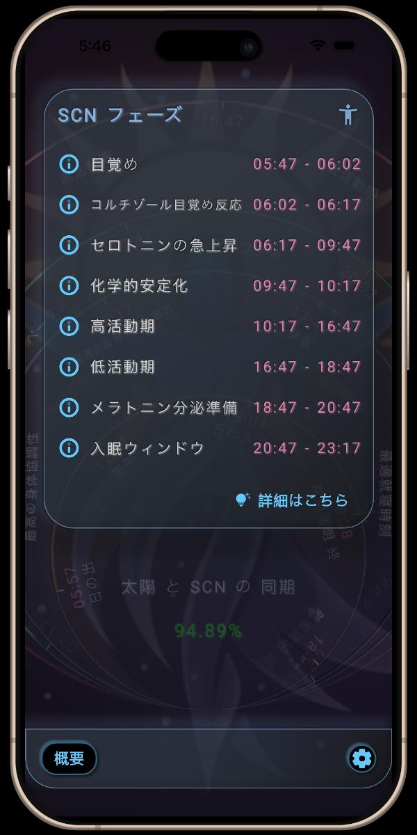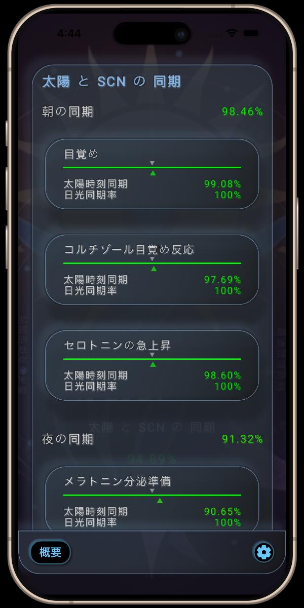 このセクションでは、その日の太陽と SCN 同期の詳細な内訳が表示され、午前と午後の同期平均のほか、それぞれの主要な SCN フェーズが示されます: