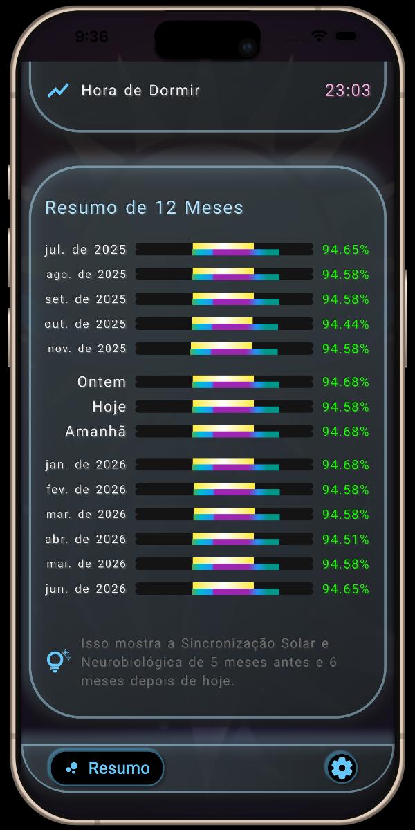 Para fornecer uma visão abrangente da sua jornada biológica, o Resumo de 12 Meses oferece uma poderosa narrativa visual do seu alinhamento ao longo das mudanças das estações. Esta seção permite que você acompanhe sua sincronização com precisão absoluta, fornecendo uma "Porcentagem de Sincronização" não apenas para hoje, mas para o dia imediatamente anterior e seguinte à sua data atual. Ao estender essa perspectiva para cobrir cinco meses no passado e seis meses no futuro, o aplicativo oferece uma visão geral completa de 12 meses do seu relacionamento com o sol. Esses dados de longo prazo permitem que você antecipe como a mudança dos ângulos solares impactará seu relógio interno ao longo do ano, garantindo que você permaneça em sincronia à medida que seu ambiente evolui.