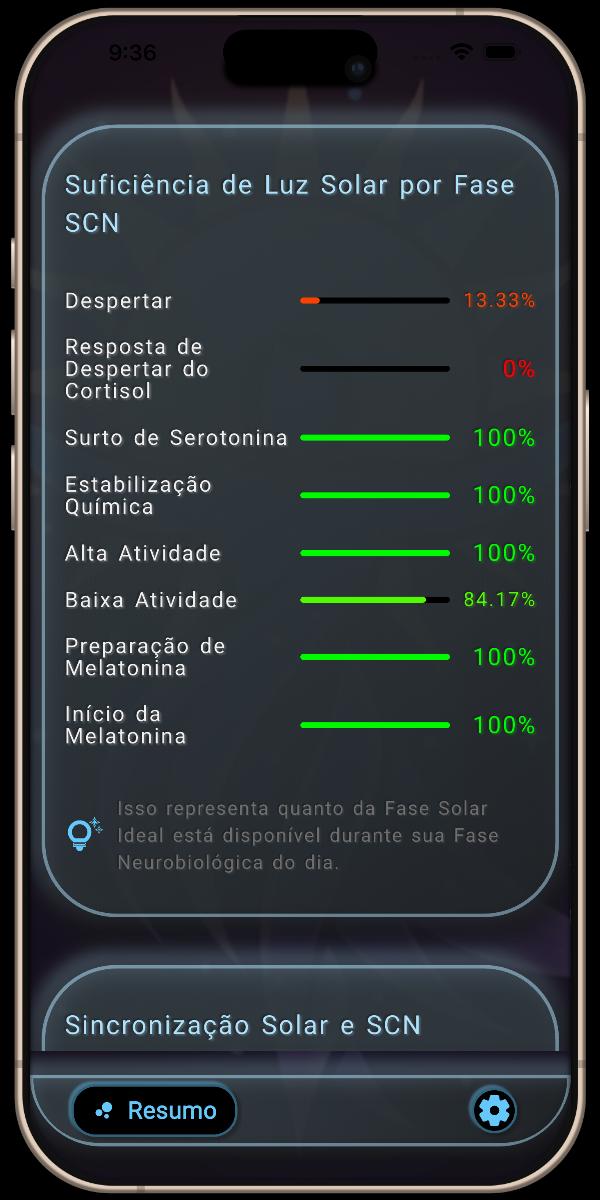 A tela principal do aplicativo é a visualização resumida das Fases Solares e Neurobiológicas, com um indicador de onde você está atualmente.