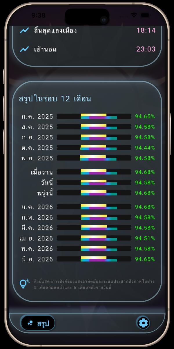 เพื่อให้คุณเห็นภาพรวมของการเดินทางทางชีวภาพ สรุปในรอบ 12 เดือนนี้นำเสนอภาพบรรยายที่มีประสิทธิภาพเกี่ยวกับการปรับตัวของคุณผ่านฤดูกาลที่เปลี่ยนแปลง ส่วนนี้ช่วยให้คุณติดตามการซิงค์ของคุณด้วยความแม่นยำสูงสุด โดยแสดง "เปอร์เซ็นต์การซิงค์" ไม่ใช่แค่สำหรับวันนี้เท่านั้น แต่ยังรวมถึงวันก่อนหน้าและวันถัดไปจากวันที่ปัจจุบันด้วย การขยายมุมมองให้ครอบคลุมอดีต 5 เดือนและอนาคต 6 เดือน ช่วยให้แอปแสดงภาพรวมความสัมพันธ์ของคุณกับดวงอาทิตย์ได้ครบ 12 เดือน ข้อมูลระยะยาวนี้จะช่วยให้คุณคาดการณ์ได้ว่ามุมของแสงอาทิตย์ที่เปลี่ยนไปจะส่งผลต่อนาฬิกาภายในร่างกายของคุณอย่างไรตลอดทั้งปี เพื่อให้แน่ใจว่าคุณจะยังคงซิงค์อยู่เสมอเมื่อสภาพแวดล้อมเปลี่ยนแปลงไป