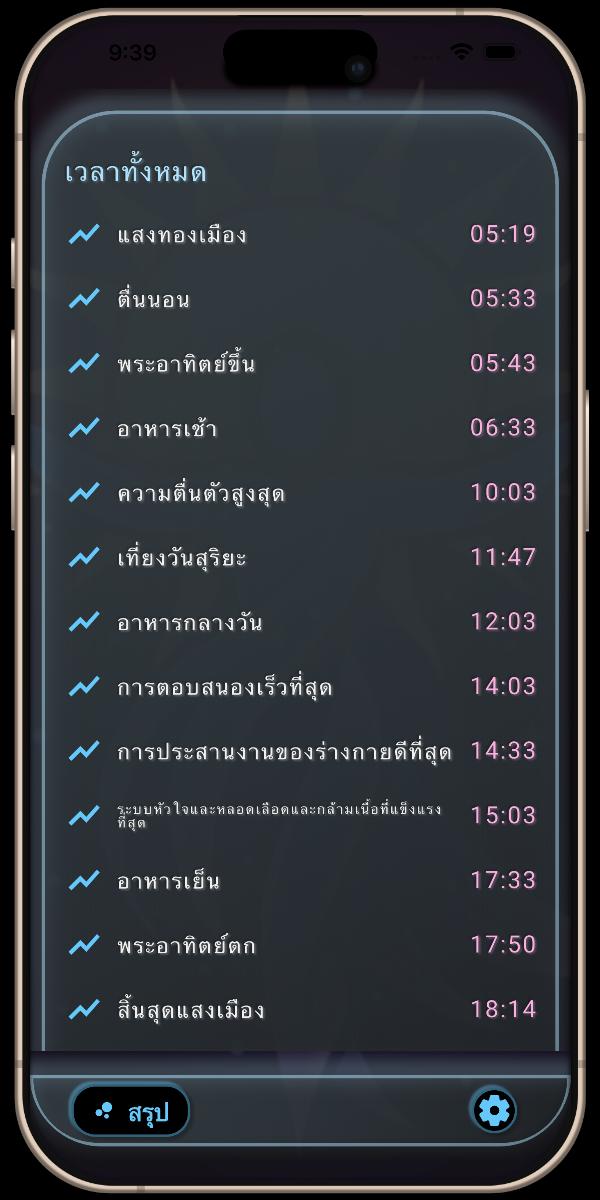 หน้าจอหลักของแอปคือมุมมองสรุปของเฟสสุริยะและเฟสทางประสาทชีวภาพ พร้อมตัวบ่งชี้ว่าปัจจุบันคุณอยู่ในช่วงใด