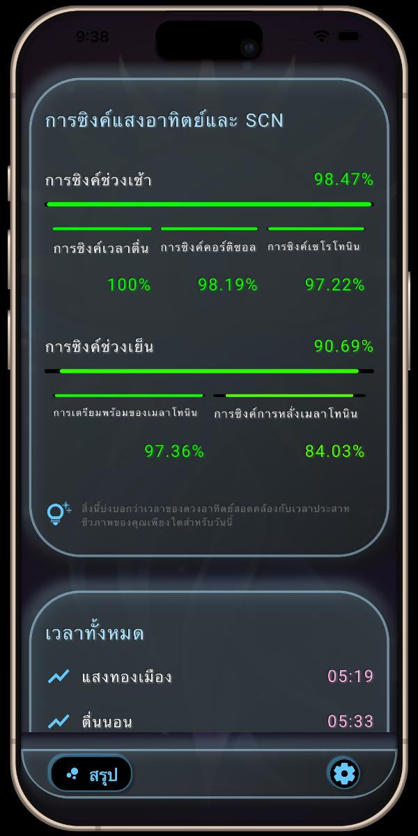 ส่วนนี้คือที่ซึ่งวิทยาศาสตร์เชิงทฤษฎีมาบรรจบกับความเป็นจริงของชีวิตประจำวันของคุณ การวิเคราะห์การซิงค์แสงอาทิตย์และ SCN จะเปรียบเทียบในระดับสูงระหว่างแสงในสภาพแวดล้อมที่แม่นยำซึ่งชีววิทยาของคุณต้องการ กับข้อมูลแสงแดดจริงที่อุปกรณ์ของคุณบันทึกได้ จากการวิเคราะห์ชุดข้อมูลทั้งสองนี้ แอปของผมจะคำนวณ "คะแนนการซิงค์" สำหรับการเปลี่ยนผ่านทางประสาทเคมีที่สำคัญที่สุดของวัน ข้อมูลภาพรวมนี้ช่วยให้คุณเห็นได้ทันทีว่าสภาพแวดล้อมปัจจุบันของคุณสนับสนุนการทำงานในระดับโมเลกุลที่สมองกำลังพยายามทำได้มีประสิทธิภาพเพียงใด