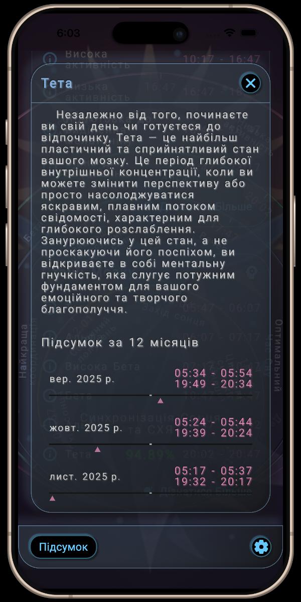 Незалежно від того, починаєте ви свій день чи готуєтеся до відпочинку, Тета — це найбільш пластичний та сприйнятливий стан вашого мозку. Це період глибокої внутрішньої концентрації, коли ви можете змінити перспективу або просто насолоджуватися яскравим, плавним потоком свідомості, характерним для глибокого розслаблення. Занурюючись у цей стан, а не проскакуючи його поспіхом, ви відкриваєте в собі ментальну гнучкість, яка слугує потужним фундаментом для вашого емоційного та творчого благополуччя.