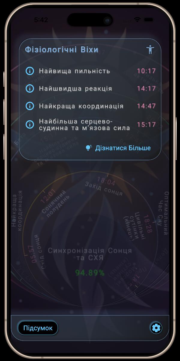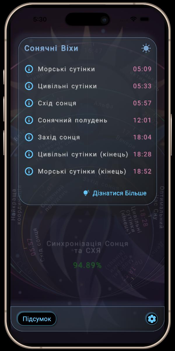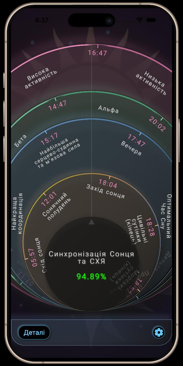 Сонячна Сила відсікає шум сучасних трендів «велнесу» і фокусується на фундаментальній математиці буття: зв’язку між світлом і життям. Оскільки кожна клітина вашого організму еволюціонувала, щоб реагувати на світ, який змінюється разом із сонцем щодня, статичних графіків уже недостатньо. Сонячна Сила використовує ваше GPS-розташування для розрахунку точних сонячних фаз для динамічного розкладу.