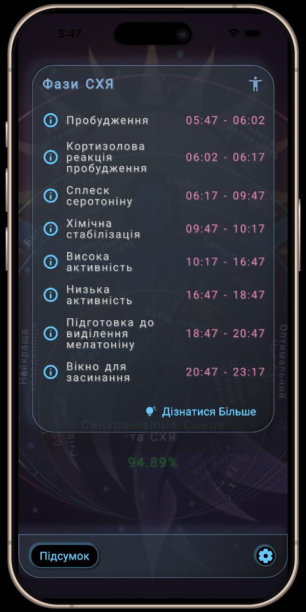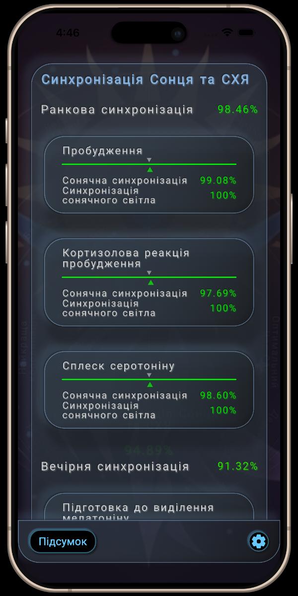 Цей розділ надає детальну інформацію про синхронізацію Сонця та СХЯ за день, показуючи середні показники синхронізації для ранку та вечора, а також їхні ключові фази СХЯ: