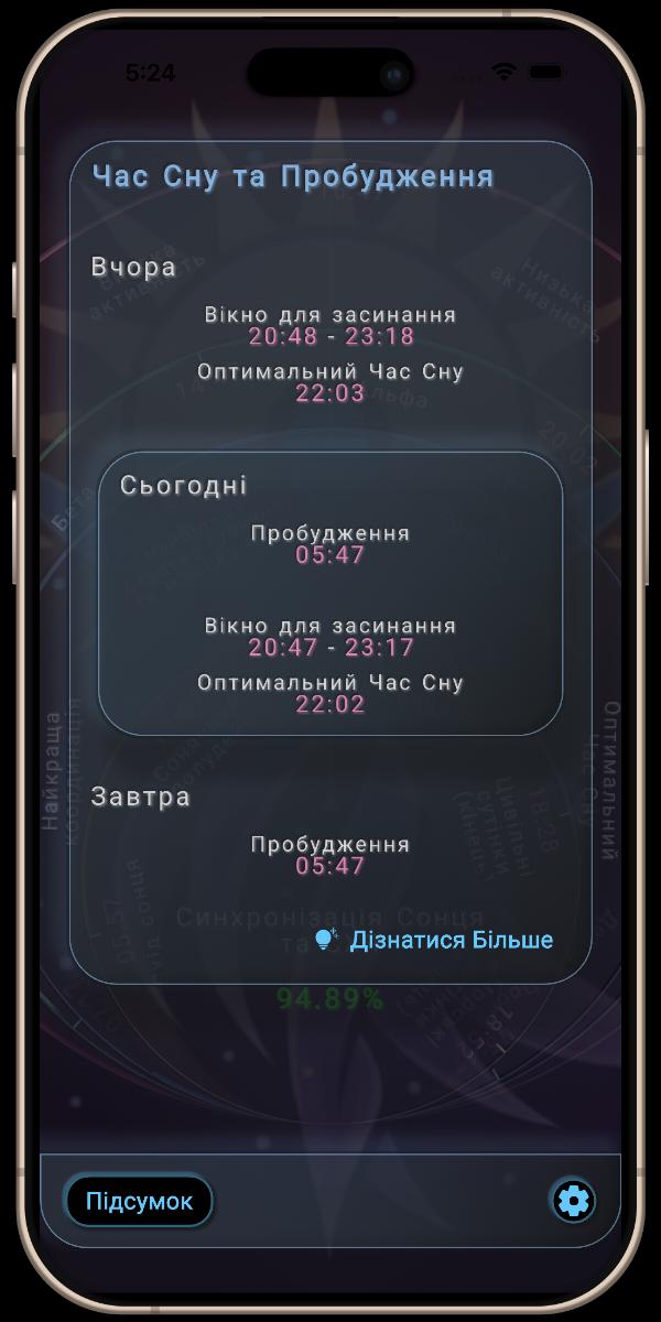 Для додаткового контексту сюди включено час відходу ко сну за попередній день, а також час пробудження на наступний день.