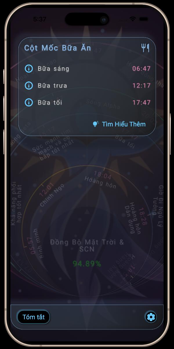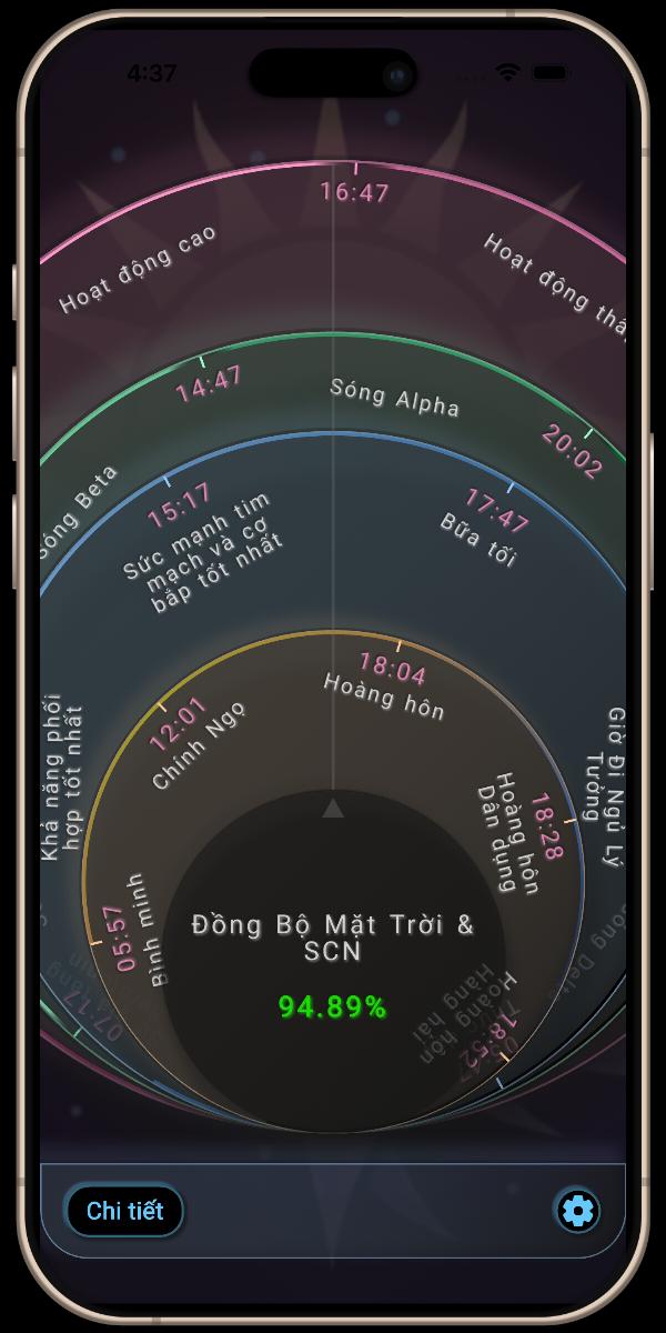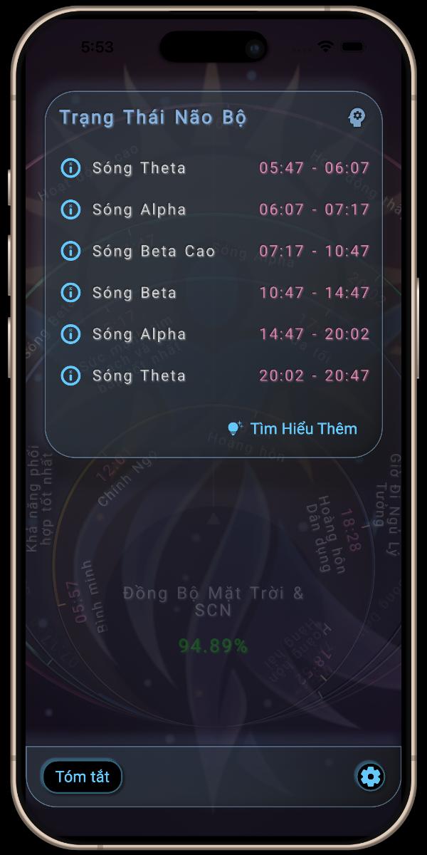 Màn hình chính của Khai Phóng Năng Lượng Mặt Trời cung cấp các dữ liệu thiết yếu mà bạn cần cho thời điểm hiện tại. Được trình bày trong các vòng xoay trực quan, dữ liệu Thần kinh Sinh học của bạn được sắp xếp thành năm danh mục chính để dễ dàng tham khảo:
