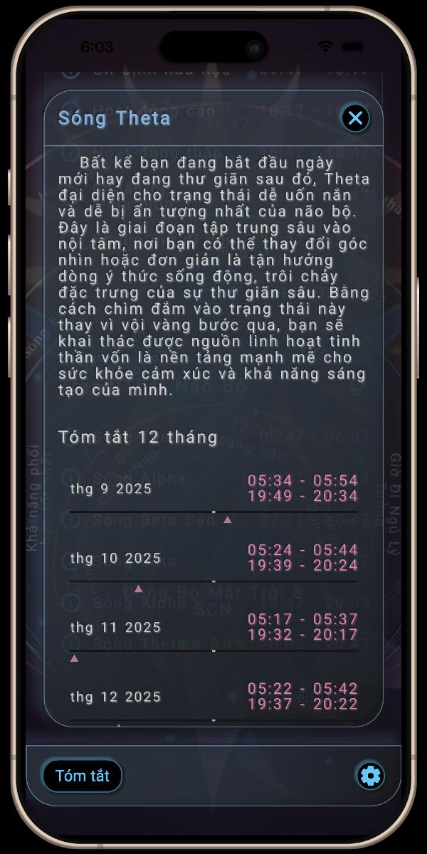 Bất kể bạn đang bắt đầu ngày mới hay đang thư giãn sau đó, Theta đại diện cho trạng thái dễ uốn nắn và dễ bị ấn tượng nhất của não bộ. Đây là giai đoạn tập trung sâu vào nội tâm, nơi bạn có thể thay đổi góc nhìn hoặc đơn giản là tận hưởng dòng ý thức sống động, trôi chảy đặc trưng của sự thư giãn sâu. Bằng cách chìm đắm vào trạng thái này thay vì vội vàng bước qua, bạn sẽ khai thác được nguồn linh hoạt tinh thần vốn là nền tảng mạnh mẽ cho sức khỏe cảm xúc và khả năng sáng tạo của mình.