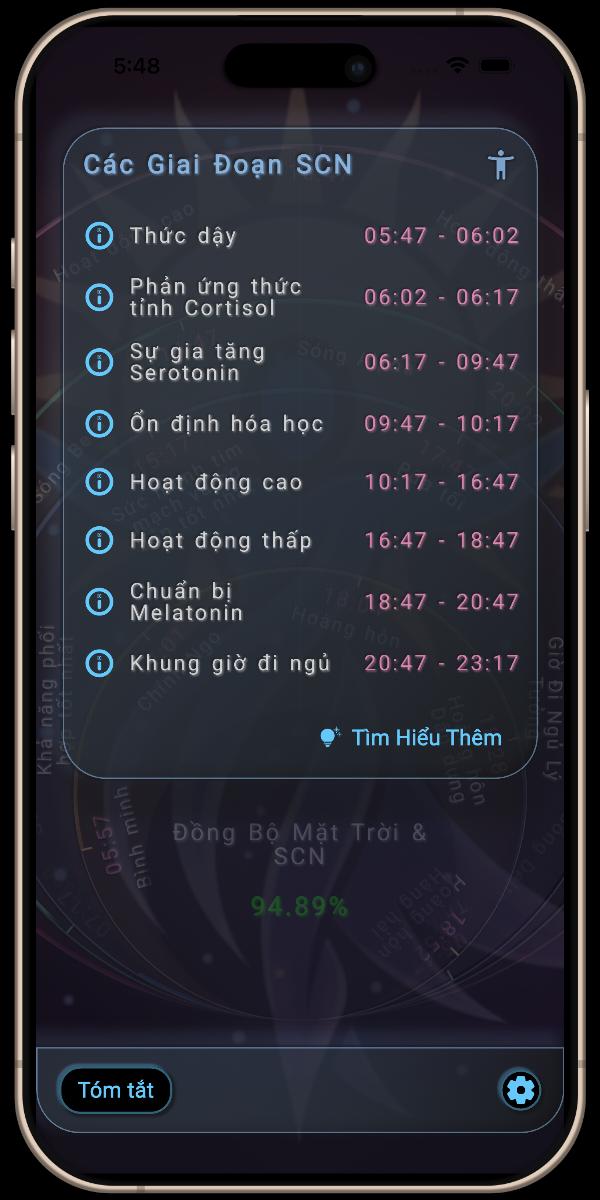 Để hiểu rõ hơn về đồng bộ Mặt trời & SCN, mỗi giai đoạn SCN chính sẽ hiển thị chi tiết cho hai biến quan trọng: