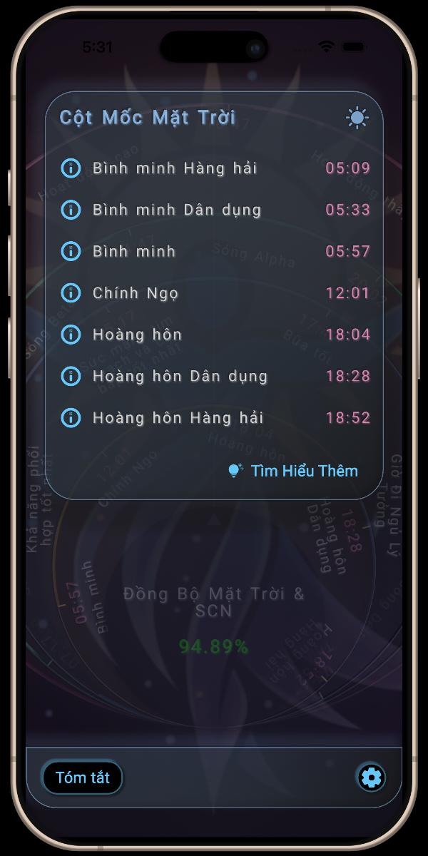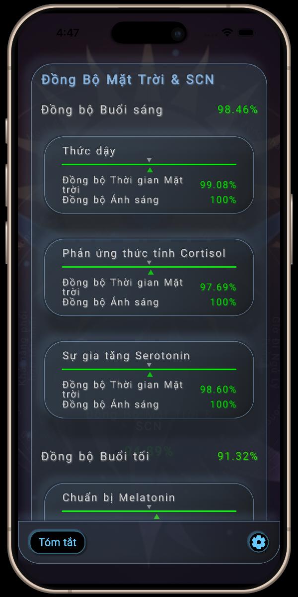 Phần này cung cấp bảng phân tích chi tiết về Đồng bộ Mặt trời & SCN trong ngày, hiển thị các mức đồng bộ trung bình cho buổi sáng và buổi tối, cũng như các giai đoạn SCN chính của chúng: