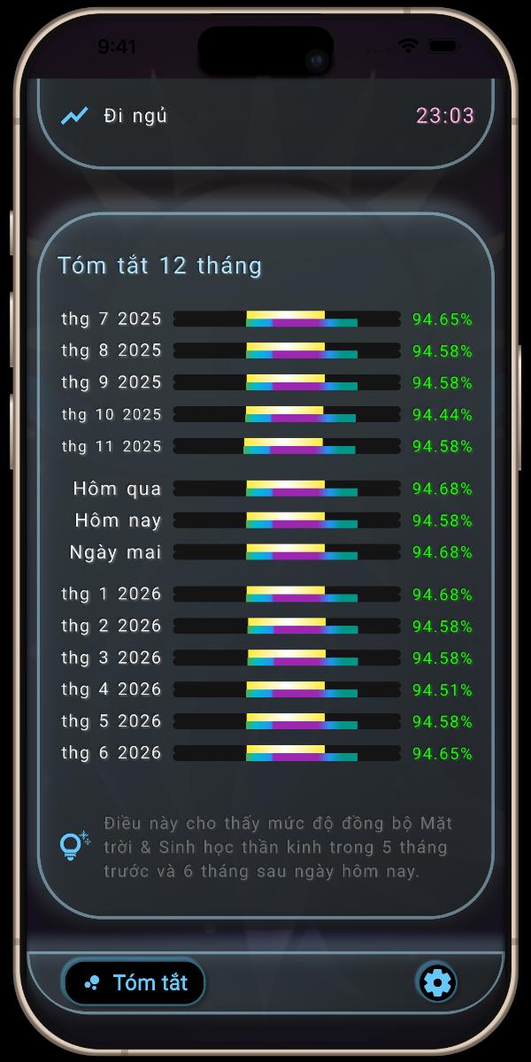 Để cung cấp cái nhìn toàn diện về hành trình sinh học của bạn, Tóm tắt 12 tháng mang đến một câu chuyện bằng hình ảnh sống động về sự điều chỉnh của bạn qua các mùa thay đổi. Phần này cho phép bạn theo dõi quá trình đồng bộ hóa của mình với độ chính xác tuyệt đối, cung cấp "Phần trăm đồng bộ" không chỉ cho ngày hôm nay mà còn cho ngày ngay trước và sau ngày hiện tại của bạn. Bằng cách mở rộng góc nhìn này để bao quát năm tháng trong quá khứ và sáu tháng trong tương lai, ứng dụng sẽ cung cấp cho bạn cái nhìn tổng quan đầy đủ trong 12 tháng về mối quan hệ của bạn với mặt trời. Dữ liệu dài hạn này cho phép bạn dự đoán các góc mặt trời thay đổi sẽ ảnh hưởng như thế nào đến đồng hồ nội tại của bạn trong suốt cả năm, đảm bảo bạn luôn đồng bộ khi môi trường phát triển.