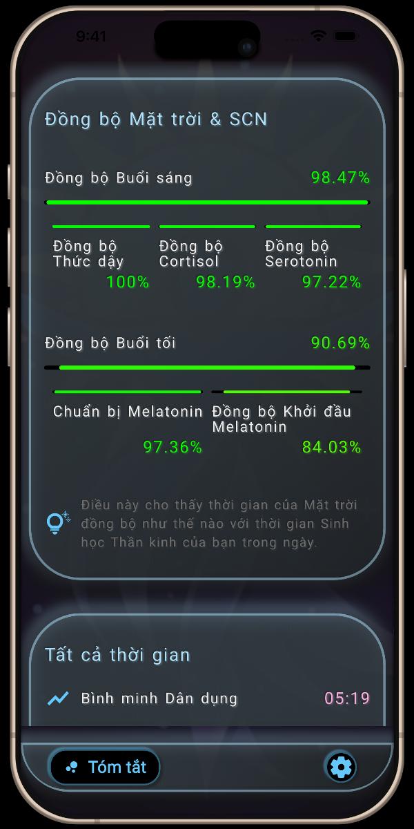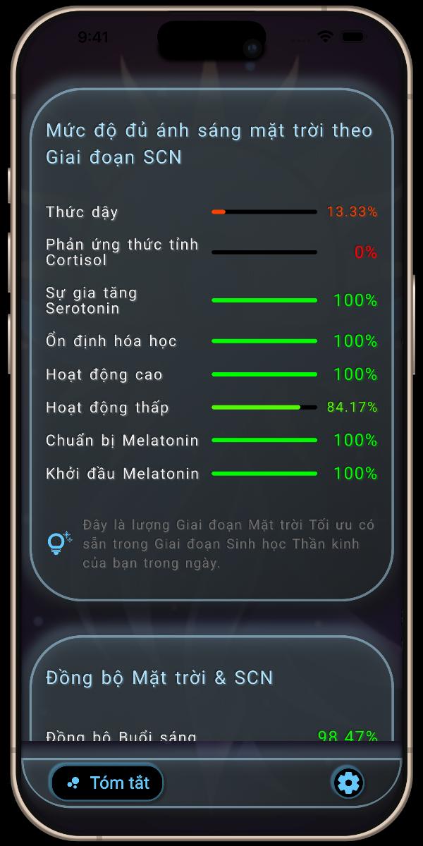 Phần này là nơi khoa học lý thuyết gặp gỡ thực tế cuộc sống hàng ngày của bạn. Phân tích Đồng bộ Mặt trời & SCN cung cấp một so sánh cấp cao giữa ánh sáng môi trường chính xác mà sinh học của bạn mong đợi và dữ liệu ánh sáng mặt trời thực tế mà thiết bị của bạn ghi lại được. Bằng cách phân tích hai bộ dữ liệu này, ứng dụng của tôi sẽ tính toán "Điểm đồng bộ" cho các quá trình chuyển đổi hóa học thần kinh quan trọng nhất trong ngày. Tổng quan này cho phép bạn nhìn lướt qua để thấy môi trường hiện tại đang hỗ trợ hiệu quả như thế nào cho các hoạt động phân tử mà não bộ của bạn đang cố gắng thực hiện.