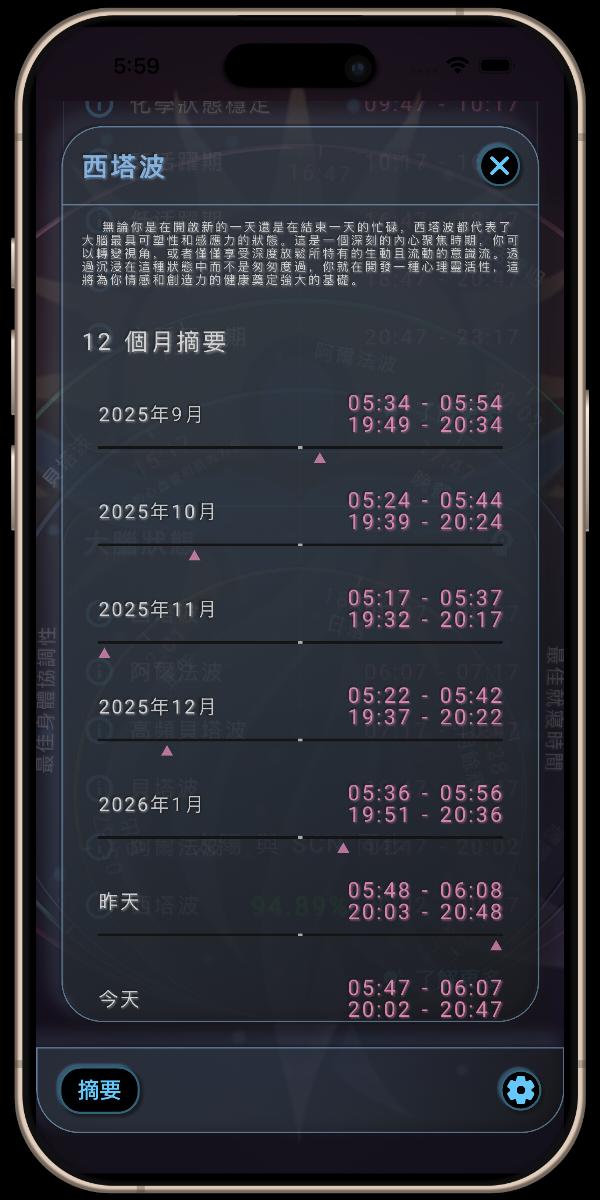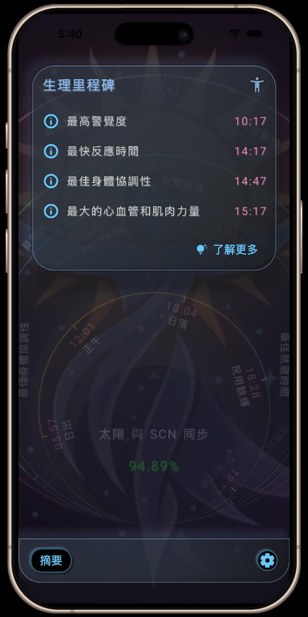太陽賦能應用的主螢幕為你提供此時此刻所需的關鍵數據。透過直觀的旋轉環展示,你的神經生物學數據被劃分為五個關鍵類別,方便無縫參考: