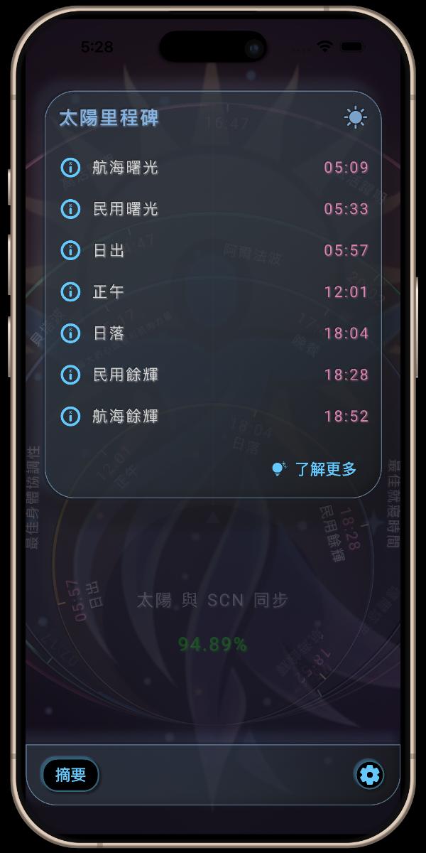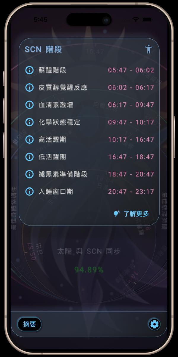 本部分提供當天太陽與 SCN 同步的詳細分析,顯示早晨和傍晚的平均同步率,以及它們各自的關鍵 SCN 階段: