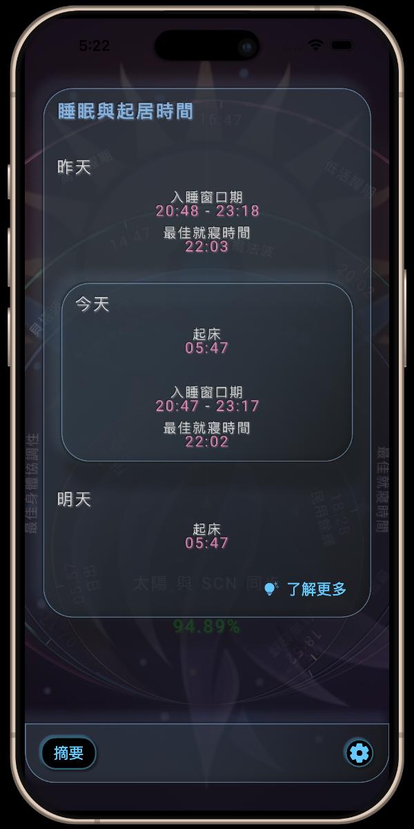 這反映了理想太陽窗口與內部 SCN 階段實際週期之間的對齊程度。「▲」圖標清晰地指示了該階段脫離同步的程度,以及它是否比理想時間更早或更晚發生。
